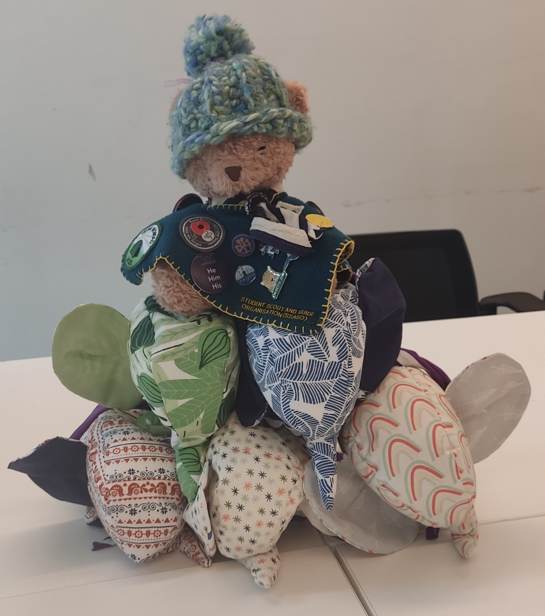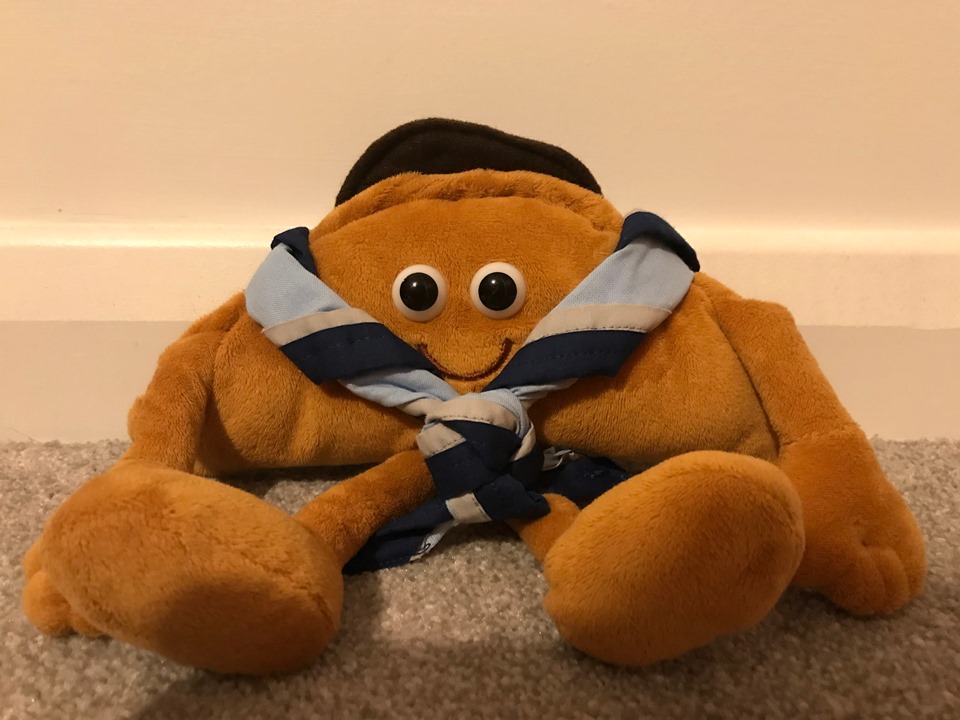 Olave (Left) is our unstealable mascot with a very cute duck Woggle Twiggle (Right) is our stealble mascot with a lovely starfish Woggle and camp blanket, displaying all 8 of our drinkers badges. |