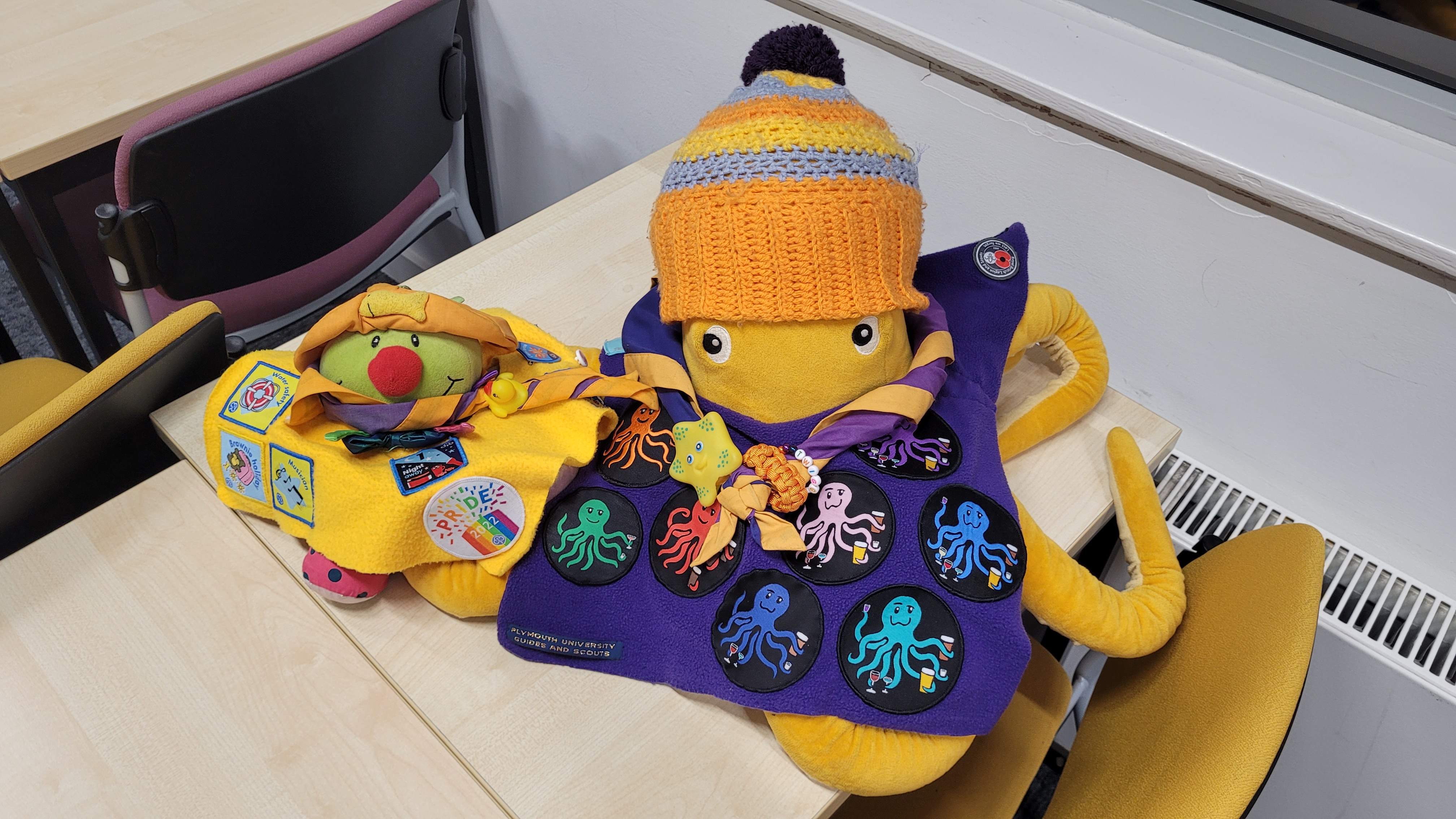 Twiggle (Right) is our stealble mascot with a lovely starfish Woggle and camp blanket, displaying all 8 of our drinkers badges.