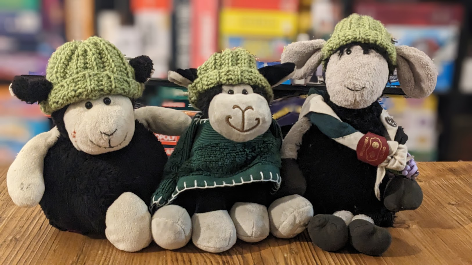 Struggling to tell our sheep apart? From right to left we have: Derek, who wears a small SUGS Scarf; Gwen, who has a cosy camp blanket; and Minty, who has a *stylish* tramp stamp of their name. All through have matching beanies for chilly camps.
