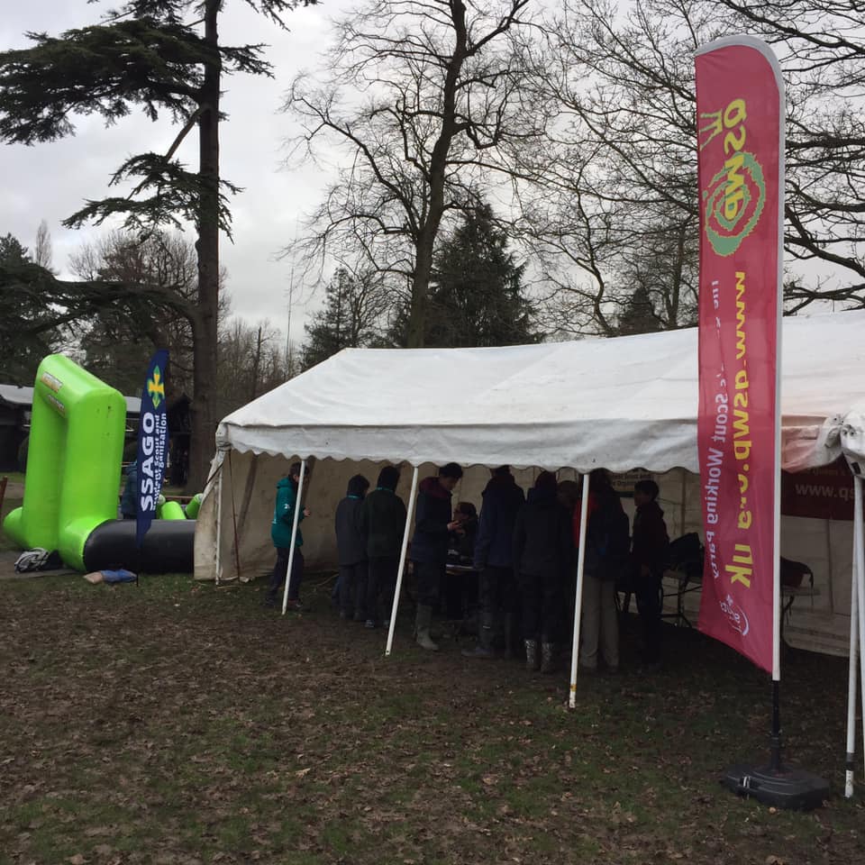 Our main activities on Saturday were running the Wintercamp challenge alongside the QSWP. Participants were tasked with 10 challenges, and if they completed all 10 they got a badge. There was a range of challenges, some involving inflatables and others testing scouting skills like knots. Some of the challenges were simple in premise but hard in reality, like a simple “pack a tent back in a tent bag” challenge, that only a few teams succeeded at all weekend. On top of that, every activity was scored, with the team that had the most points overall winning vouchers and goodies. Subsequently there was a big incentive for participants to try their best.